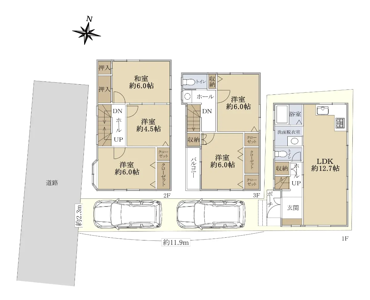 駐車スペースは2台駐車可能(2.3m×11.9m)車両サイズには一定的制限がございます。