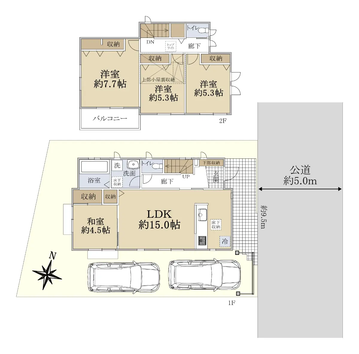 LDKは約15.0帖、主寝室は約7.7帖のゆとりある広さを持ち、