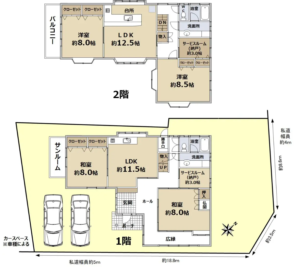 カースペースは2台分あり(車種による)、カーポートもございますので便利にお使いいただけます。