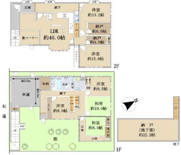 土地面積は93.66坪、建物は6LDK+納戸×3の間取りで、LDKは約40帖ございます。また地下室(納戸)があり、約22.2帖の広さとなっております。
